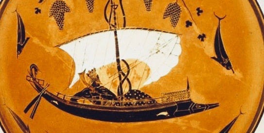 Aegeus has asked him to hoist white sails as news of success; black sails mean he’s failed. Theseus forgets the request, and when Aegeus sees the black-sailed ship returning from Crete he throws himself into the sea in sorrow.