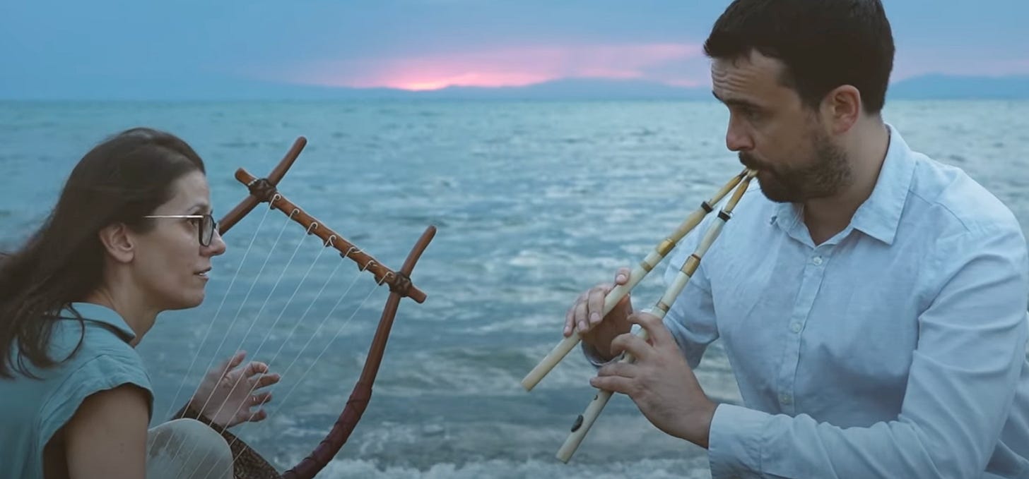 My friend the piper and musician Callum Armstrong asked me to write about Anacreon, having here demonstrated on the ancient Poseidonia aulos (double pipe), together with Rosa Fragorapti on lyre, the metre of “anacreontics”. This catchy rhythm, used par excellence by the poet-songwriter Anacreon of Teos (c. 573-495 BC), grows out of a pattern of long and short syllables (called ‘ionics’) which creates a line of duplicated rhythm:
